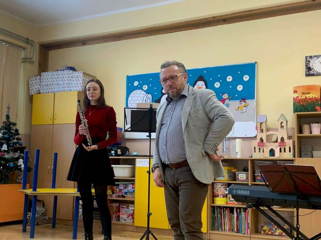 We wtorek dzieci wzięły udział w kolejnej audycji muzycznej „Filharmonia przedszkolaka”. Pan Mirek przedstawił kolejny instrument z rodziny dętych, blaszanych „obój”, opowiadał niezwykłe historie o kompozytorach, utworach oraz instrumencie. Pani Maria grała różne melodie w świątecznym i zimowym nastroju