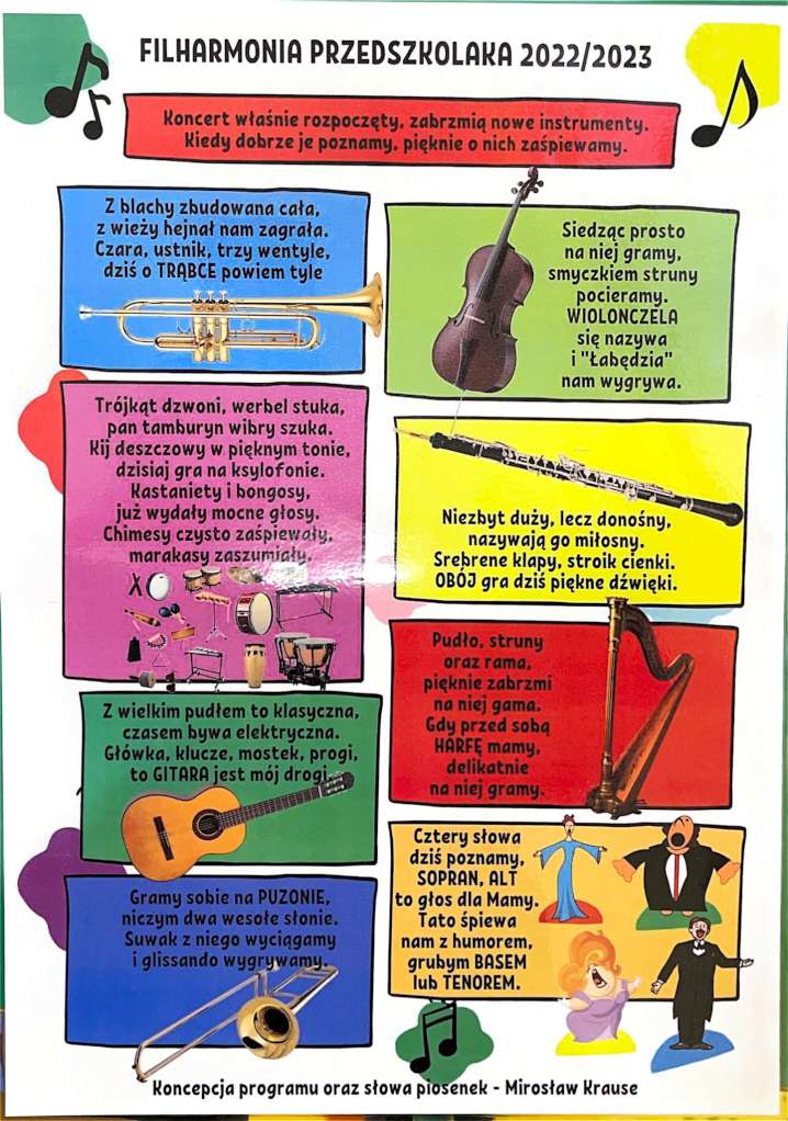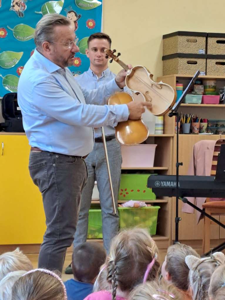 Dzieci poznały niezwykły instrument jakim są skrzypce. Każdy koncert to prezentacja kolejnych instrumentów muzycznych występujących w orkiestrach symfonicznych. Przedszkolaki poznały budowę instrumentu, zajrzały do jego wnętrza, spróbowały rownież wydobyć z nich dźwięki. Założeniem programu jest ogólna edukacja muzyczna połączona z poznawaniem zasad obowiązujących podczas koncertów, spektakli czy przedstawień, prezentowana w sposób dostosowany do wieku odbiorców